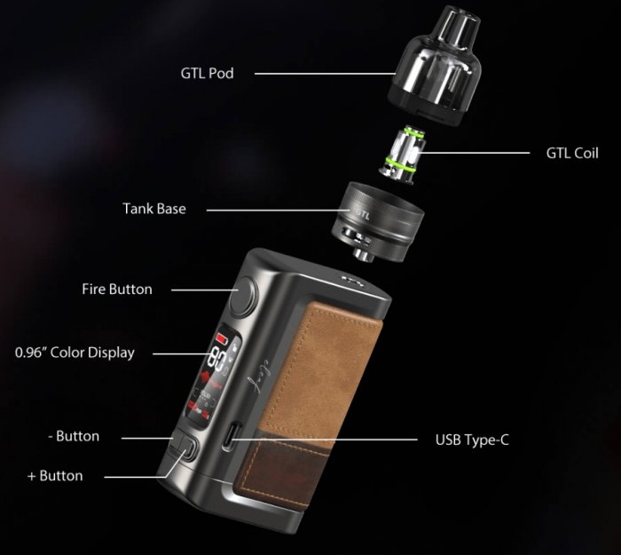 Farebný 0,96-palcový TFT displej ponúka podrobné informácie o nastavení. Medzi ďalšie funkcie patrí ochrana proti skratu, prehriatiu, prehriatiu, nízkemu odporu a 10-sekundová ochrana žhavenia.