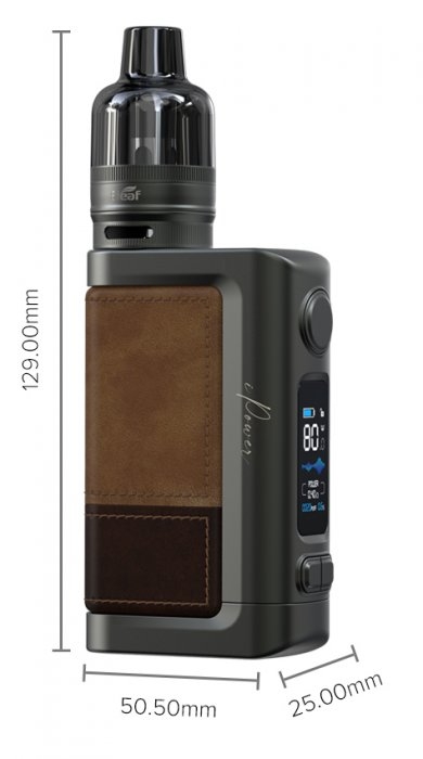 Eleaf iStick Power 2 je vďaka masívnemu telu potiahnutému kožou a zabudovanej 5000mAh batérie s rýchlym 2A nabíjaním cez port USB-C doslova grip. Okrem bežného režimu POWER podporuje inteligentný čip INSIDE režimy SMART a VOLTAGE, ktoré obsahujú inteligentné odporúčanie výkonu/napätia pre rôzne odpory žhaviacich hláv.